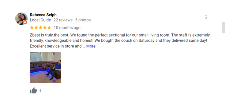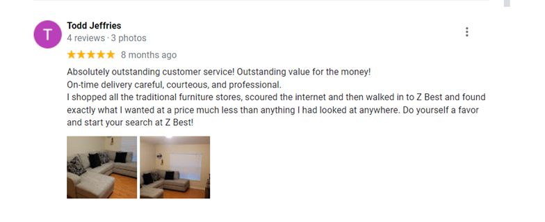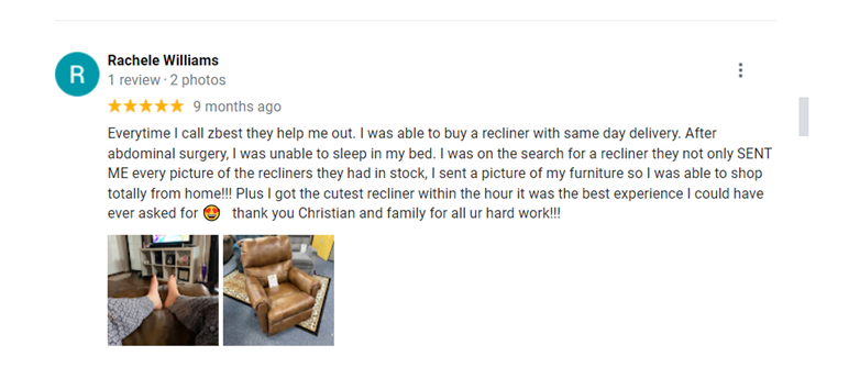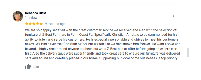 -Pat MclaughlinChristian was great! Very helpful staff. Would highly recommend Z-best when shopping for furniture and other items for your home.