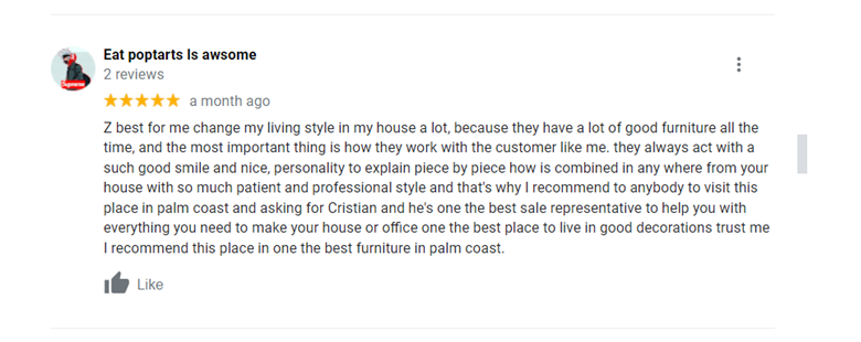 Love this furniture store. Personalized service. Gave me a better deal that I found on Amazon for the item I was looking for, plus they assembled and delivered the item. The entire staff is professional, friendly, efficient and very helpful. Thank you all for your expertise.